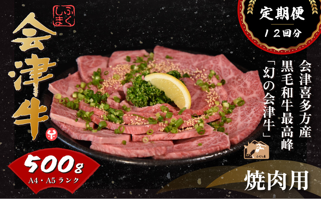 【検索用キーワード】牛肉 国産 黒毛和牛 焼肉 500g A5 A4 冷凍 会津喜多方産 定期便 12か月