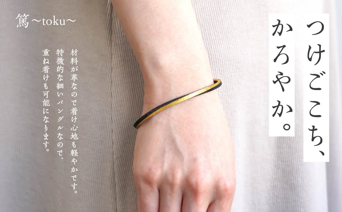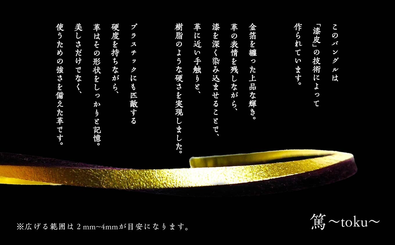 革に黒漆を塗って金箔を置いた細目のバングルです。