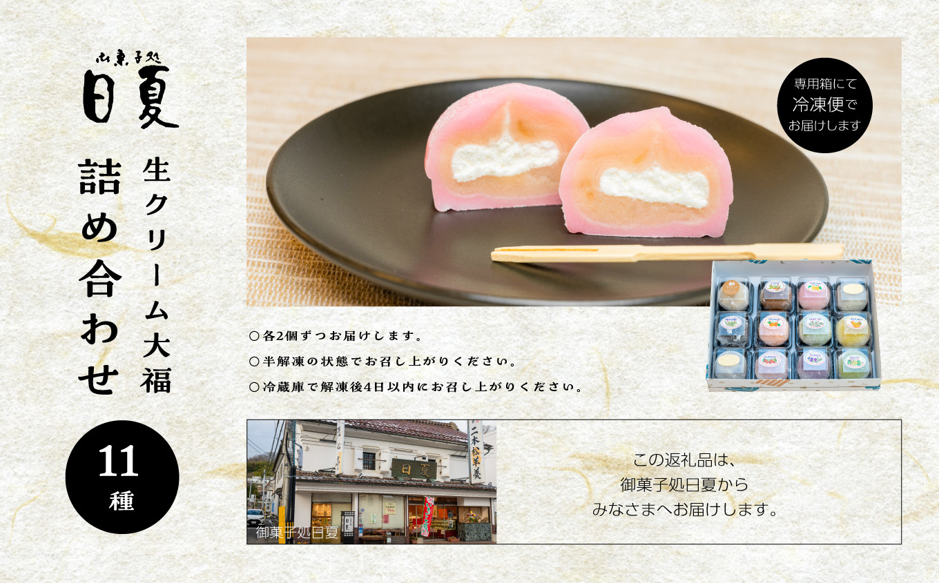 日夏おすすめ、11種の生クリーム大福! 日夏の生クリーム大福詰め合わせ(12個入) 大福 生クリーム大福 和菓子 生クリーム 詰め合わせ 食べ比べ 冷凍 小分け おすすめ お中元 お歳暮 ギフト 二本松市 ふくしま 福島県 送料無料【菓子処日夏】