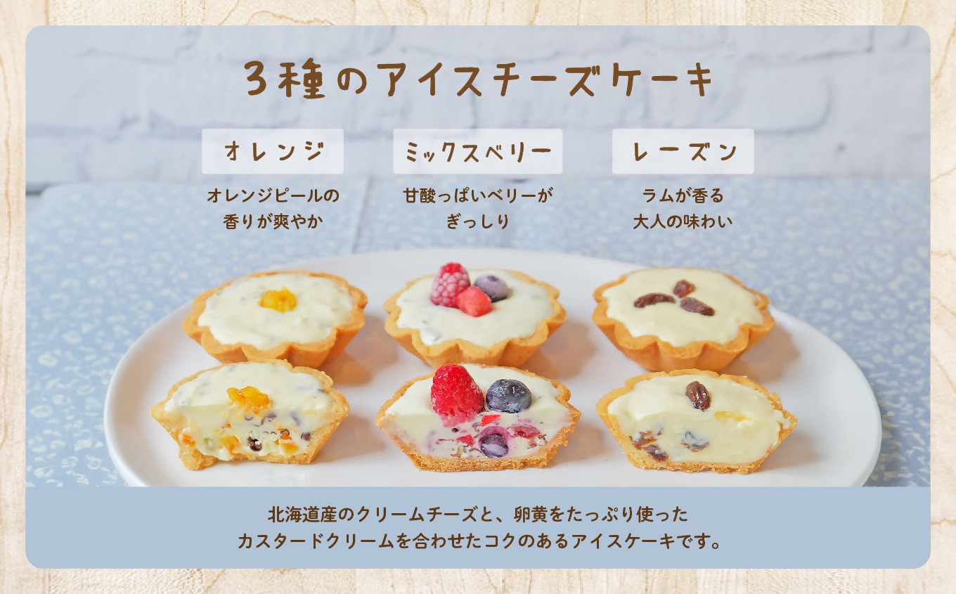 北海道産のクリームチーズと、卵黄をたっぷり使ったカスタードクリームを合わせたコクのあるアイスケーキに、ドライフルーツとチョコレートを合わせて、お花の形のタルトに詰めた、かわいいアイスケーキです。