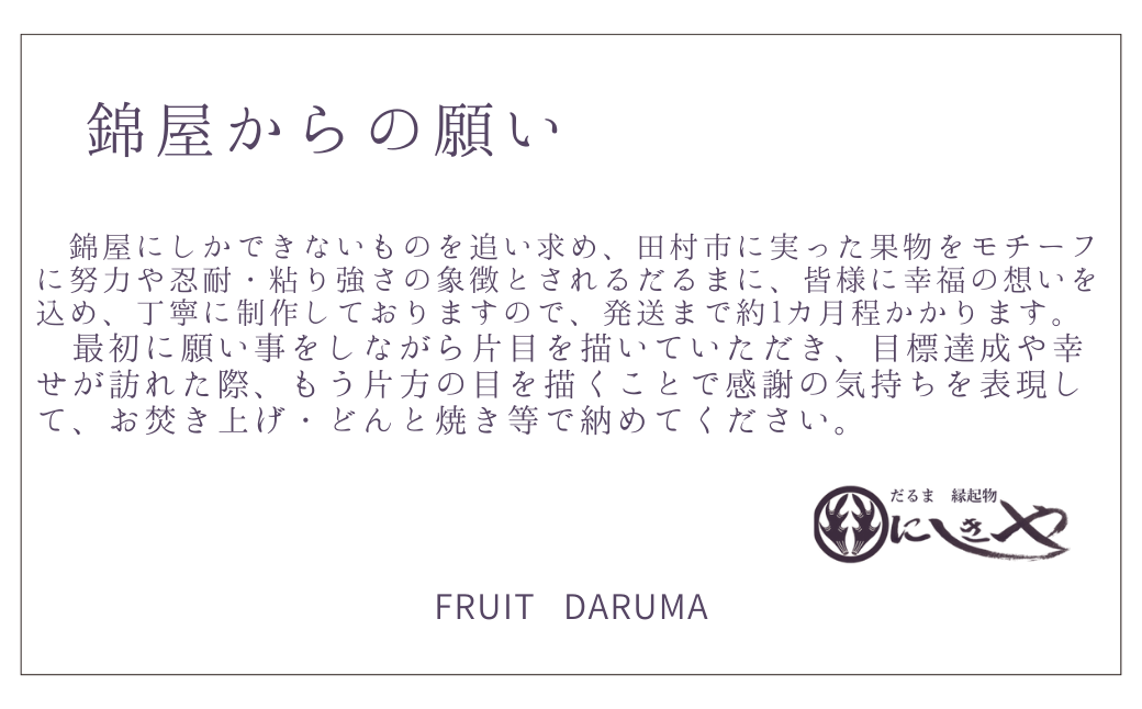 『フルーツだるま』は、田村市に実った果物をモチーフにした錦屋独自の商品となります。