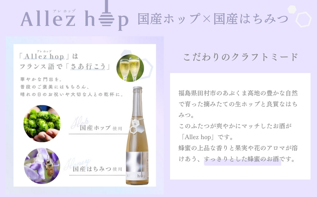 国産ホップと国産はちみつを使用した、こだわりのクラフトミード! クラフトミード Allez hop(アレ・ホップ) 500ml 1本・2本 ギフト箱入り ハチミツ 蜂蜜 ホップ 発泡酒 酒 アルコール 地酒 ギフト 贈答 プレゼント 熨斗 地域限定 福島県 田村市 福島 ふくしま HOPJAPAN ホップジャパン