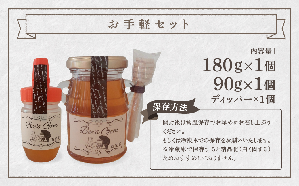 | 容量 | 【お手軽セット】 ・純粋はちみつ 90g×1個・180g×1個 ・ハニーディッパー×1個 |