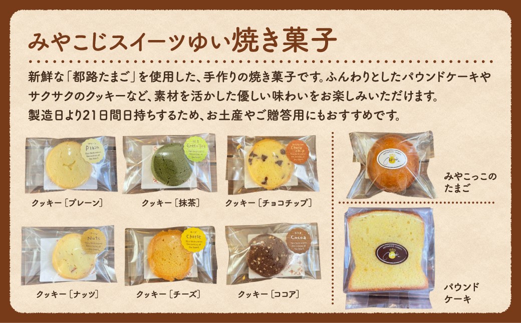 ふんわりとしたパウンドケーキやみやこっこのたまご、サクッとした食感のクッキーなど、手作りならではの優しい味わいをお楽しみください。