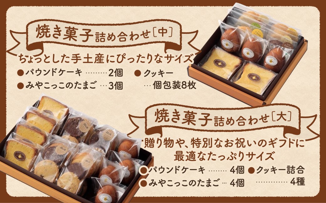 | 容量 | 中サイズ:パウンドケーキ2個/みやこっこのたまご3個/クッキー8枚(個包装) 大サイズ:パウンドケーキ4個/みやこっこのたまご4個/クッキー詰合4種 |