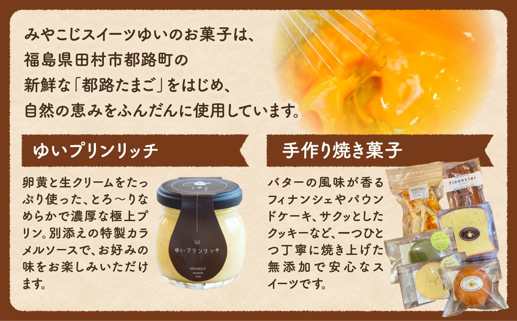 手作りならではの優しい味わいをお楽しみください! ゆいプリンリッチと焼き菓子セット(S・M・L) クッキー 洋菓子 プリン スイーツ お菓子 贈答用 プレゼント ギフト 箱入り ご褒美 母の日 父の日 お祝い お返し お土産 手土産 田村市 福島県 みやこじスイーツゆい