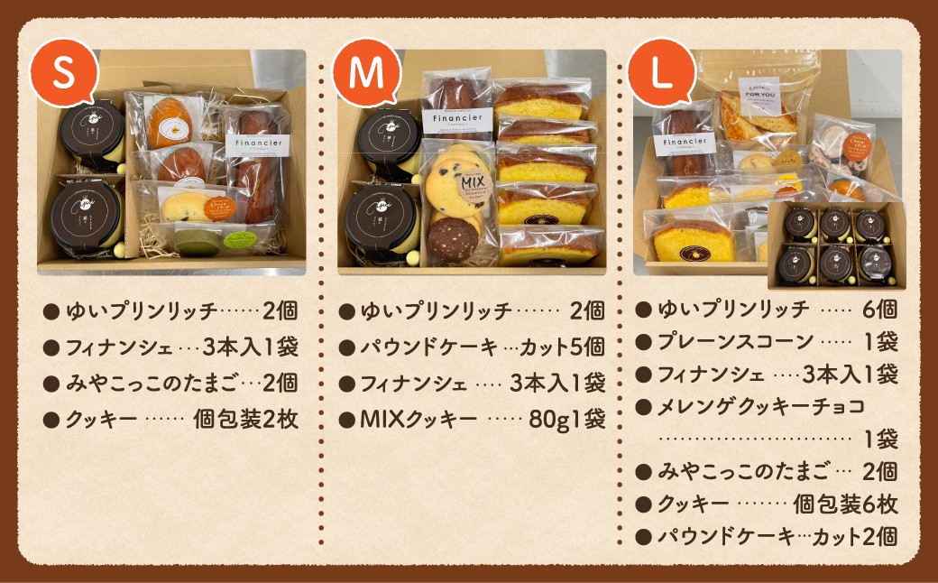 | 容量 | S:ゆいプリンリッチ2個/フィナンシェ3本入1袋/みやこっこのたまご2個/クッキー個包装2枚 M:ゆいプリンリッチ2個/パウンドケーキカット5個/フィナンシェ3本入1袋/MIXクッキー80g1袋 L:ゆいプリンリッチ6個/プレーンスコーン1袋/フィナンシェ3本入1袋/メレンゲクッキーチョコ1袋/みやこっこのたまご2個/クッキー個包装6枚/パウンドケーキカット2個 |