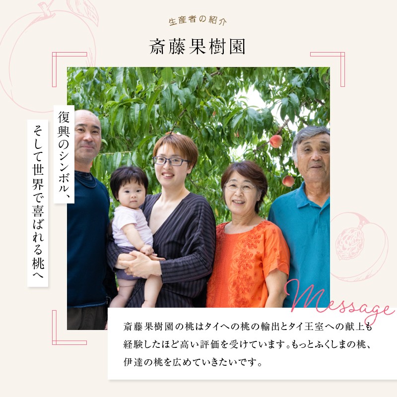 <あかつきとは> 福島県を代表する桃の1つ「あかつき」 7月下旬からお盆まで福島県を盛り上げます。 はじめは固いですが、追熟させることで、ある程度柔らかくなり食べごろを迎えます。 斎藤さんは伊達市保原地区で4代続く桃農家です。 本物の味を求めて、日々新鮮な桃を生産し、東京をはじめとした関東地方や仙台を中心に日本全国に自信を持って美味しい桃を送っています。 毎年、桃の時期になると他方面から斎藤さんのところへお客さんがやってきて、桃を注文されているのが夏の風物詩です。