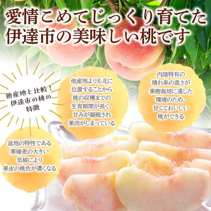 全国でも有数の桃の産地で有名な福島県伊達市。 伊達市特産の桃をお手軽に楽しんでいただけるセットを開発しました! セットする桃は1玉270g前後でJAの共選場で特秀と格付けされた桃を選んでいます。 福島県を代表する桃「あかつき」をお送りします。 「あかつき」 果肉は緻密で果汁が多くジューシーです。 見た目も鮮やかな紅色で香りがよく、甘みと酸味のバランスに優れています。