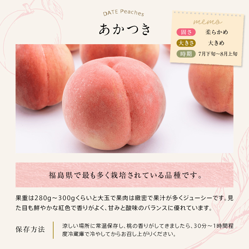 「あかつき」は福島県を代表する桃の品種で、福島県でとれる桃の半数を占めています。 「あかつき」の実は、緻密な果肉のやや硬めの品種である一方果汁はジューシーで、果重は280g~300gほどとなる大玉の桃です。 見た目は鮮やかな紅色で香りがよく、甘みと酸味のバランスに優れています。 より日持ちさせるために、新聞紙などで優しく包んで風通しの良い涼しい場所で保存し、柔らかくなってきたらさらにポリ袋に入れ、冷蔵庫の野菜室で保存してください。 甘みの感じ方が弱くなってしまうので、冷やしすぎには注意してください。 【伊達市のもものおいしさの秘訣】 福島県伊達市は盆地性の気候となり、桃の生育にぴったりな気候です。 夏に暑く強い日差しが降り注ぐことで、甘さをたっぷりと含んだ色付きの良い桃となります。 伊達市のおいしいももをぜひお楽しみください。
