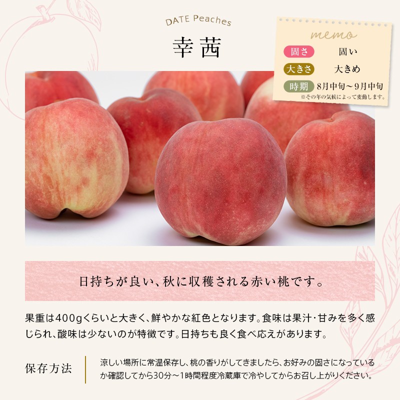 大きめの桃として有名で硬さもほどよくあり、甘みもあります。さくら白桃に並んで後半期に入る桃の中では人気の一種です。