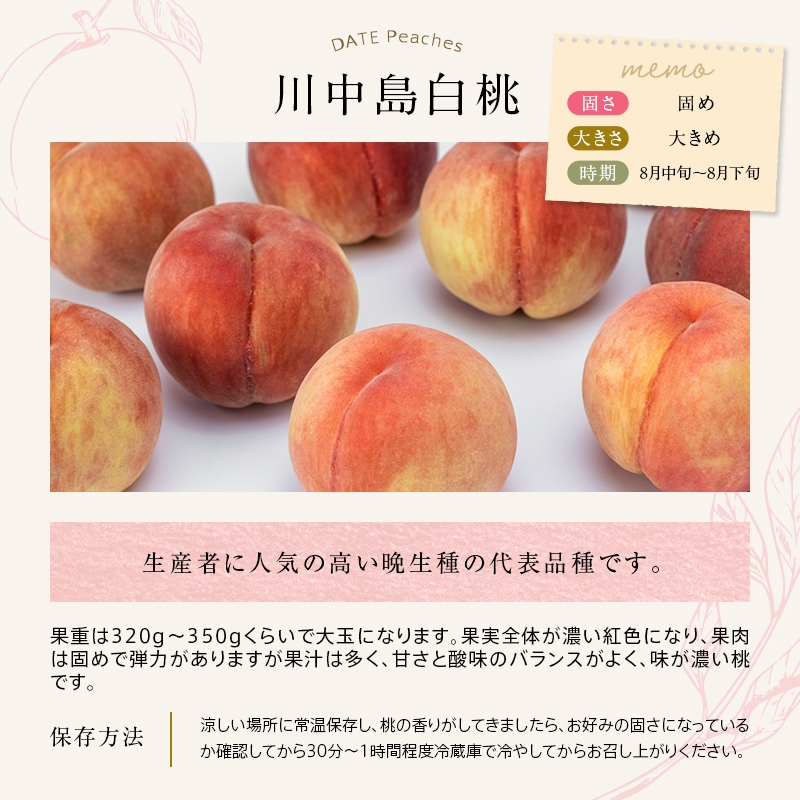 甘さは強く酸味が少なく、日持がするのも特徴です。固めの桃が好きな方におすすめです。