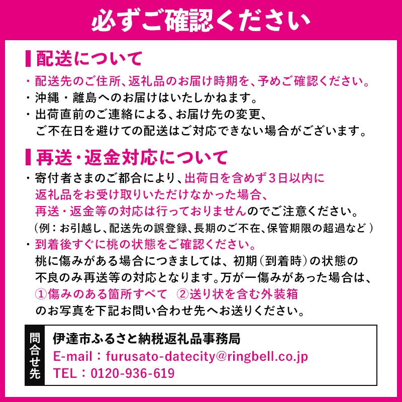 ・到着後傷みがあった場合は、すぐに福島県伊達市ふるさと納税事務局までメールまたは電話にてご連絡をお願いいたします。時間が経過してからのご連絡になりますと、初期(到着時)の状態の不良とは判断できないため、再発送は致しかねますのであらかじめご了承ください。