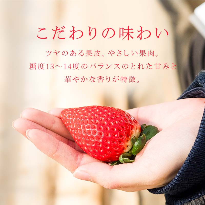 「ふくはる香」は、福島県が開発したオリジナル品種! ほのかに桃のような甘くてさわやかな香りがして、スッキリとした甘味が魅力で、洗練された風味が楽しめるイチゴ。福島県で多く栽培されています。 表面はツヤツヤで美しく、果肉はほどよい固さ。 先端部の糖度が13~14度ととても甘く、酸味も強すぎず弱すぎず適度なバランスで果汁も豊富です。 鏡石農遊園は、東京農大卒業の二代目若手夫婦とそのご家族で美味しい様々な分野で評価されている「いちご」を栽培されています!香り高く、味わい深く、甘いいちごです! 【鏡石農遊園】 鏡石町の苺農家。親子は2代で福島県で品種改良した「ふくはる香」を生産しています。 苺農家としては30年、農家としては100年という歴史ある農家さんです。 「ふくはる香」のその味に惚れ込んでUVランプの導入や、温度や湿度二酸化炭素濃度などの管理に力をいれ品質向上に努めています。福島県内の百貨店で高値で販売されていたり、都内のさまざまなバイヤーから評価されています。 ※沖縄・離島への配送は対応できません。また、長期間の配送における品質劣化については責任を負いかねますので、ご了承ください。 ※画像はイメージです。