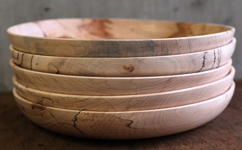 この皿に見える黒い筋は「スポルテッド」と言われ、立木の段階で道管に侵入した菌類が作り出した紋様です。メープルのスポルテッド材は高級なエレキギターに使われています。