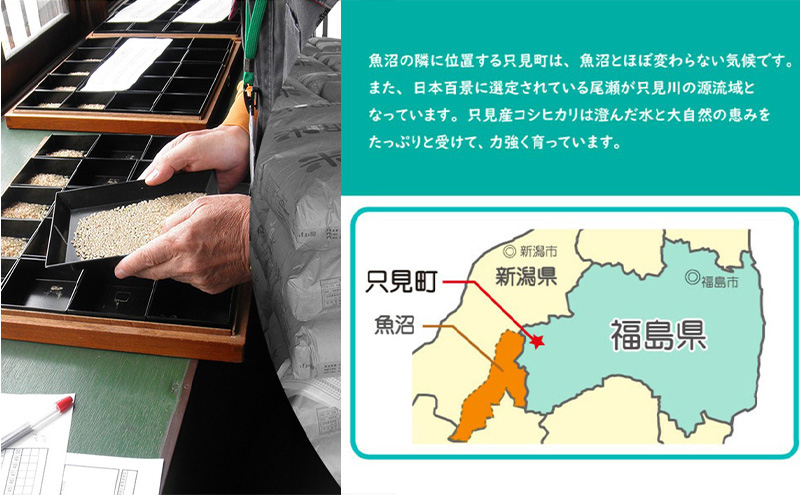 魚沼の隣に位置する只見町は魚沼とほぼ変わらない気候と尾瀬の澄んだ水で栽培をしています。大自然の恵みをたっぷりと受けて育ったコシヒカリ本来の特徴をしっかり実感していただけます。