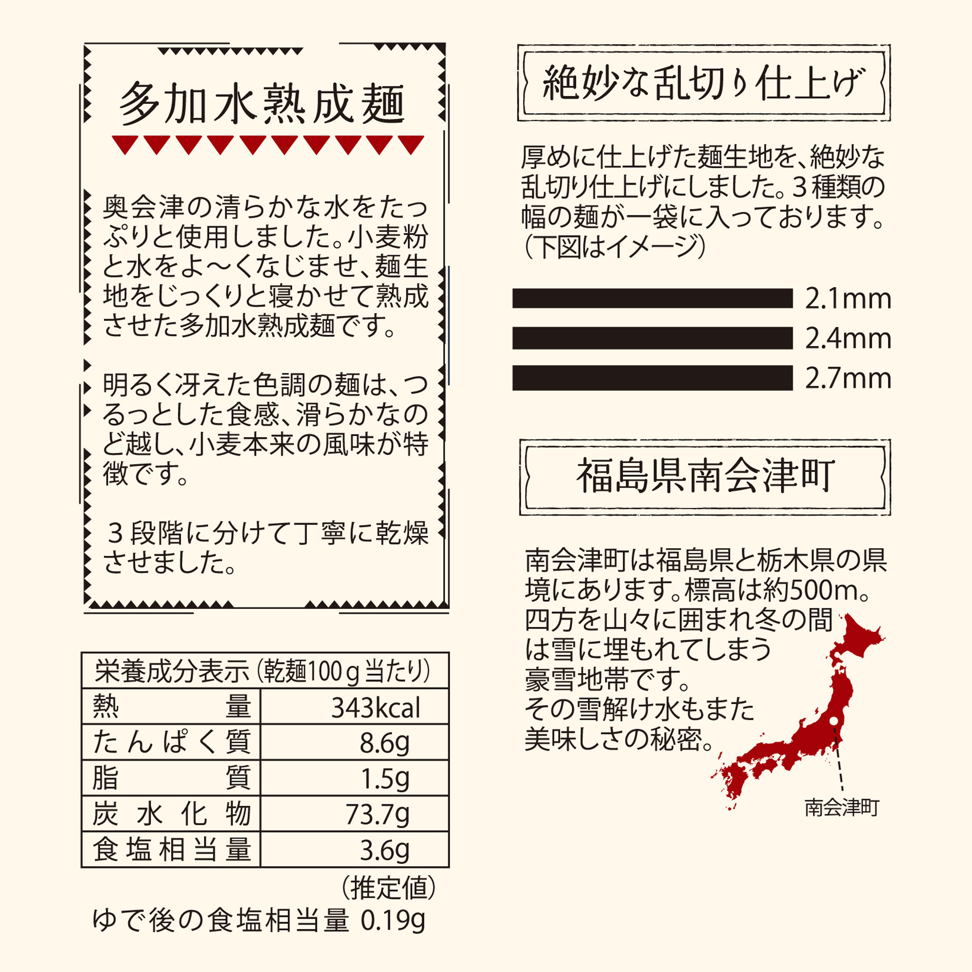 奥会津の清らかな水をたっぷりと使用し、小麦粉とよ~くなじませ、麺生地をじっくりと寝かせて熟成させた多加水熟成麺です。