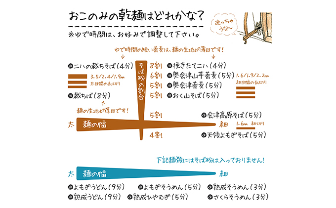 | 容量 | ・裁ちそば200g×3束 ・会津高原そば200g×2束 ・おく山そば200g×2束 ・熟成そうめん200g×2束 |