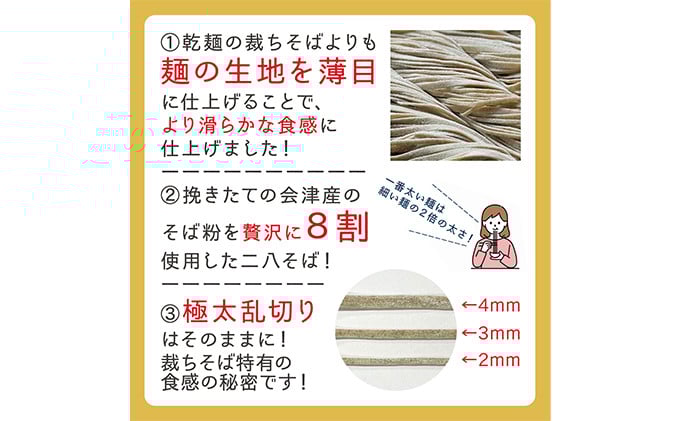 今年度収穫された会津産の新そば粉を贅沢に八割使用した生そばです。新そば粉ならではの、新鮮なそばの香り・風味・歯切れをお楽しみいただけます。
