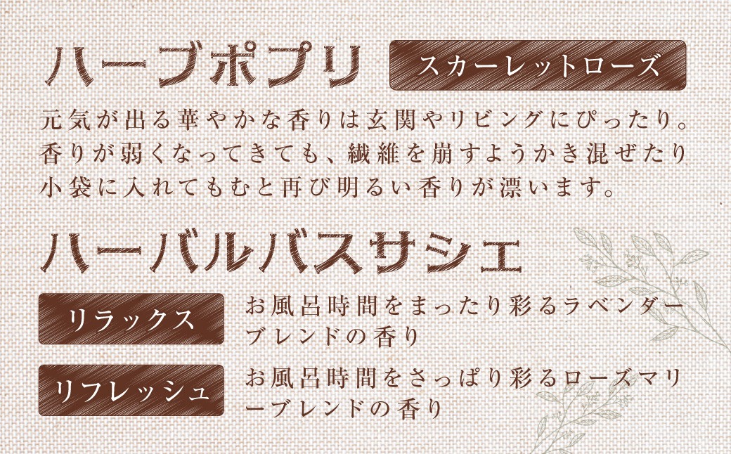 | 容量 | ハーブポプリ×1 ハーバルバスサシェ×2 |