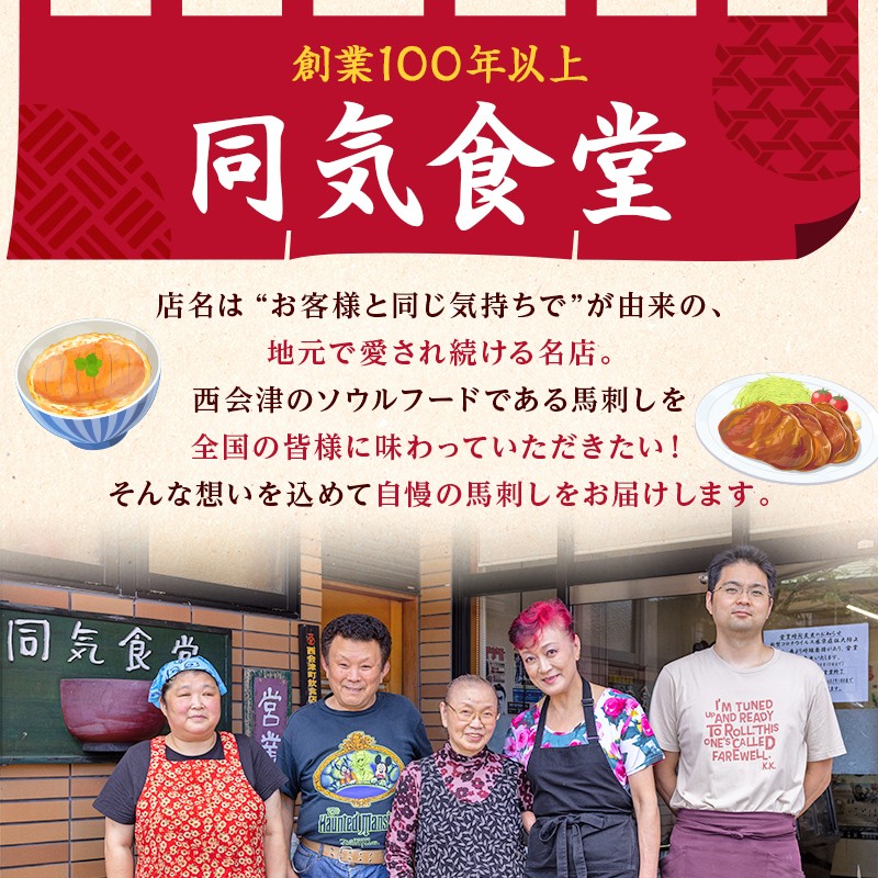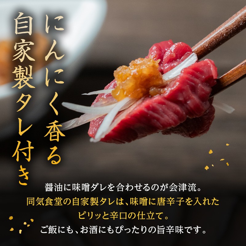 創業以来変わらないおいしさ!人気の自家製タレ付 大正10年創業【同気食堂】福島県の老舗の味「会津の馬刺し」自家製タレ付 (約150g×5) にく 肉 お肉 馬肉 赤身 ヘルシー 福島県 西会津町 F4D-1429