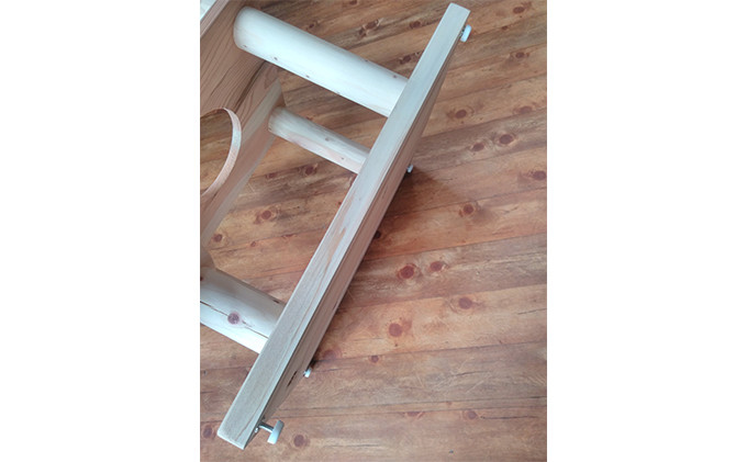 すべての丸太支柱が、写真のように出荷時点で縦方向に割れがあります。材料の丸太は、性質上割れるため、割れた部分が広がらないように補強しています。丸太を使用する理由として、丸太1本杉またはヒノキは、加工した支柱に比べ非常に固く、長年ご愛用いただくためです。木は湿度の差により常に呼吸するため、季節や温度・湿度の差でご自宅等へ商品到着後、割れが多少広がることや土台が反ることがございます。土台が反ってぐらつくようでしたら、写真の4隅の調節ネジ(家具に使用される床を傷つけにくいネジ)で段差の調節をお願いいたします。