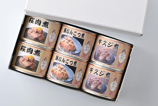 | 容量 | 桜肉煮缶詰 190g×2缶 豚なんこつ煮缶詰 200g×2缶 牛スジ煮缶詰 180g×2缶 |