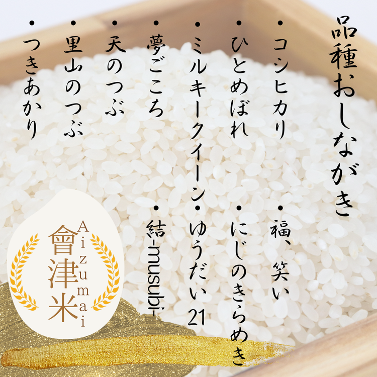 コシヒカリ・ひとめぼれ・ミルキークイーン・夢ごこち・天のつぶ・里山のつぶ・つきあかり・福、笑い・にじのきらめき・ゆうだい21・特別栽培米コシヒカリ