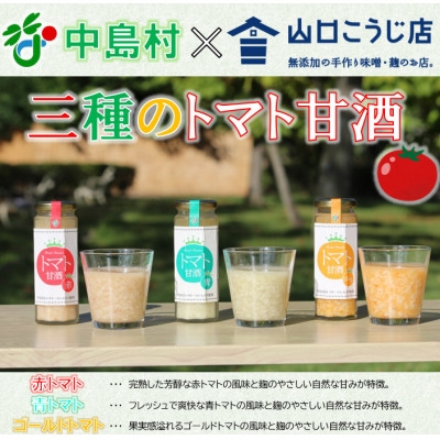 トマト甘酒は中島村と山口こうじ店が共同開発したオリジナル商品!真っ赤に完熟して甘みのあるトマトを発酵させた「赤トマト甘酒」、未熟ながらもみっちりと実の詰まった青トマトを発酵させた「青トマト甘酒」、淡い酸味と濃厚な甘みが特徴のゴールドトマトを発酵させた「ゴールドトマト甘酒」。それぞれ味や風味、甘みに特徴があり、同じトマトでも味わいの違いを楽しめます!