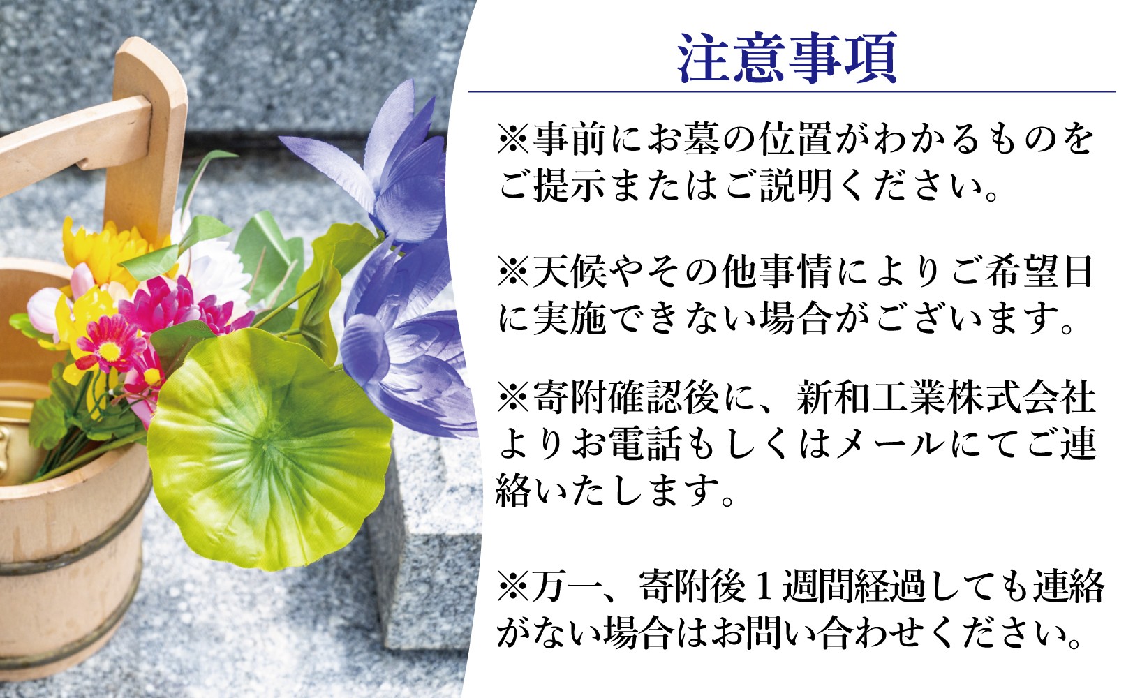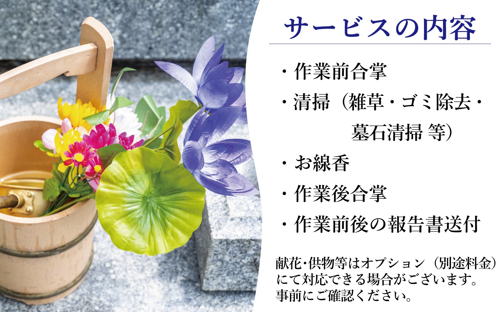 ・ご希望によっては、清掃時間等を調整し、墓花、おつまみ、お酒等の供物を提供することも可能です。ただし高額になる物や入手困難な物等につきましては、代替品となる場合がありますので予めご了承願います。