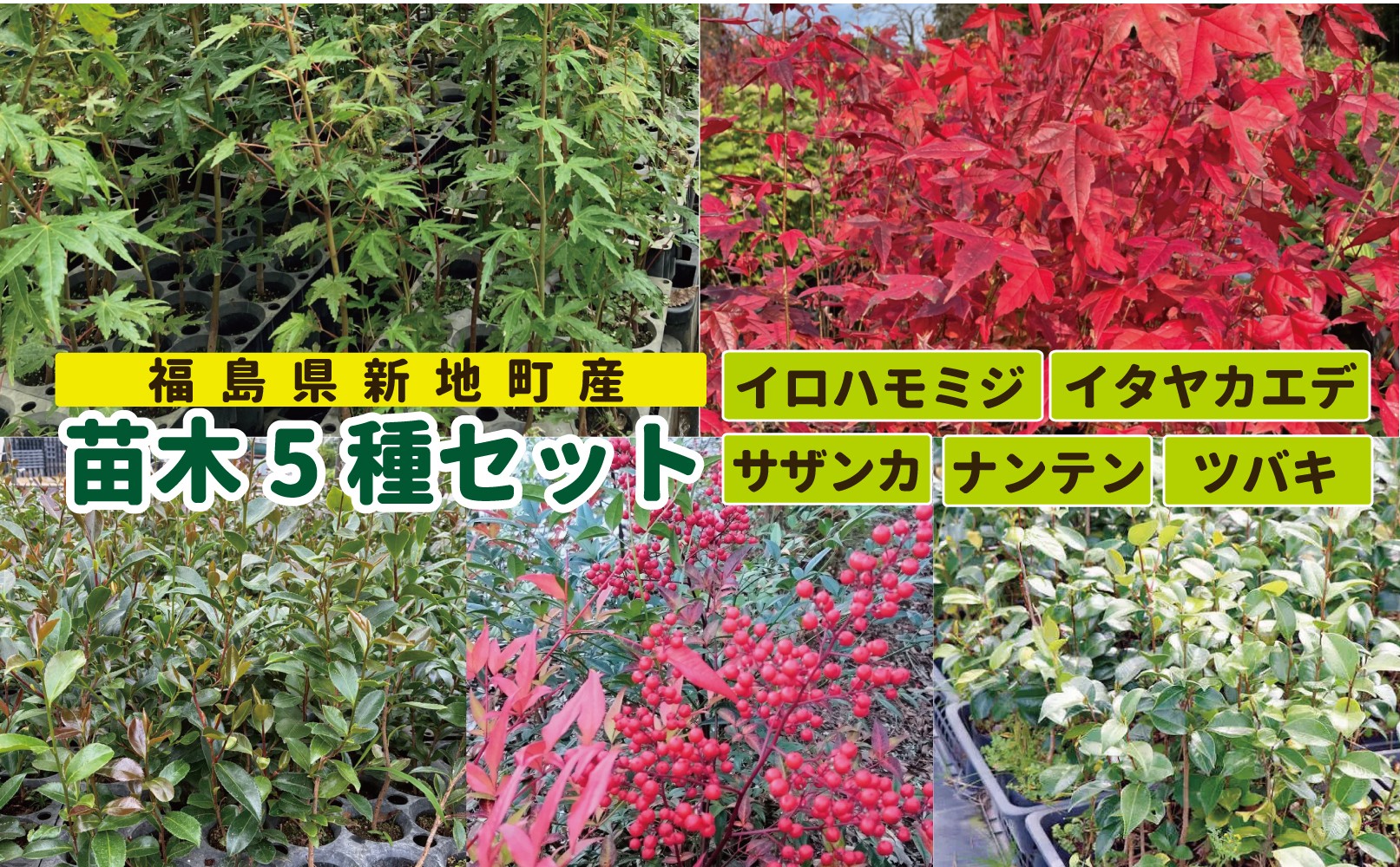 さざんか、イロハモミジ、南天、イタヤカエデ、椿 四季を感じる里山の苗木セット 新地町産 苗木5種セット(サザンカ・イロハモミジ・ナンテン・イタヤカエデ・ツバキ) | 木 苗 人気 おすすめ 送料無料 里山 お取り寄せ 福島県 新地町 庭木 庭 森林 山茶花 さざんか いろはもみじ 紅葉 南天 なんてん 椿 つばき いたやかえで