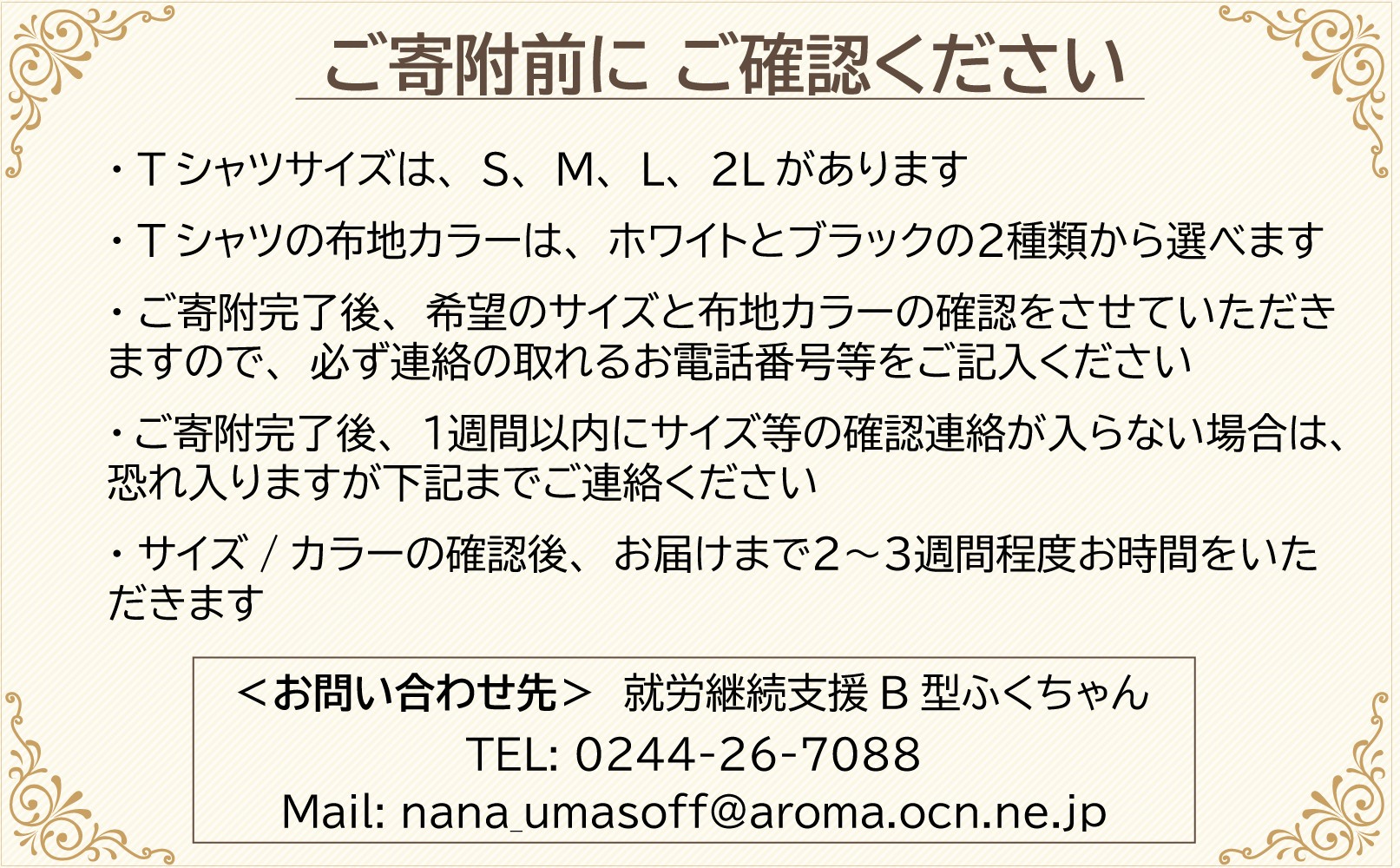 | 発送期日 | サイズ・カラーの確認後、お届けまで2~3週間程度 |