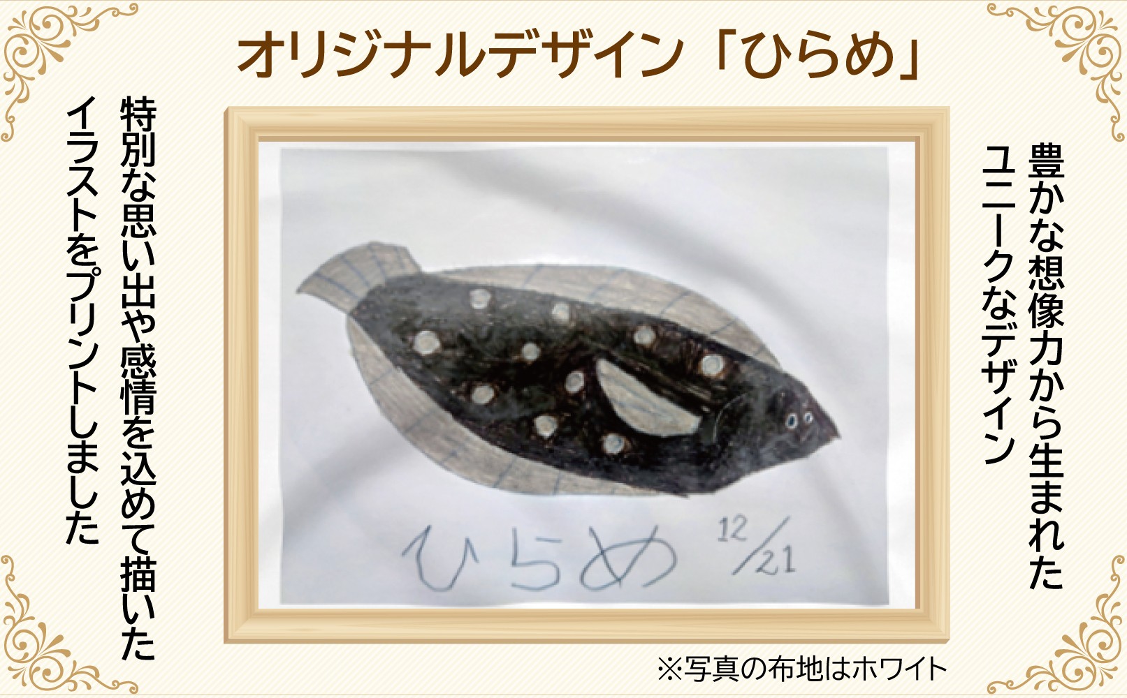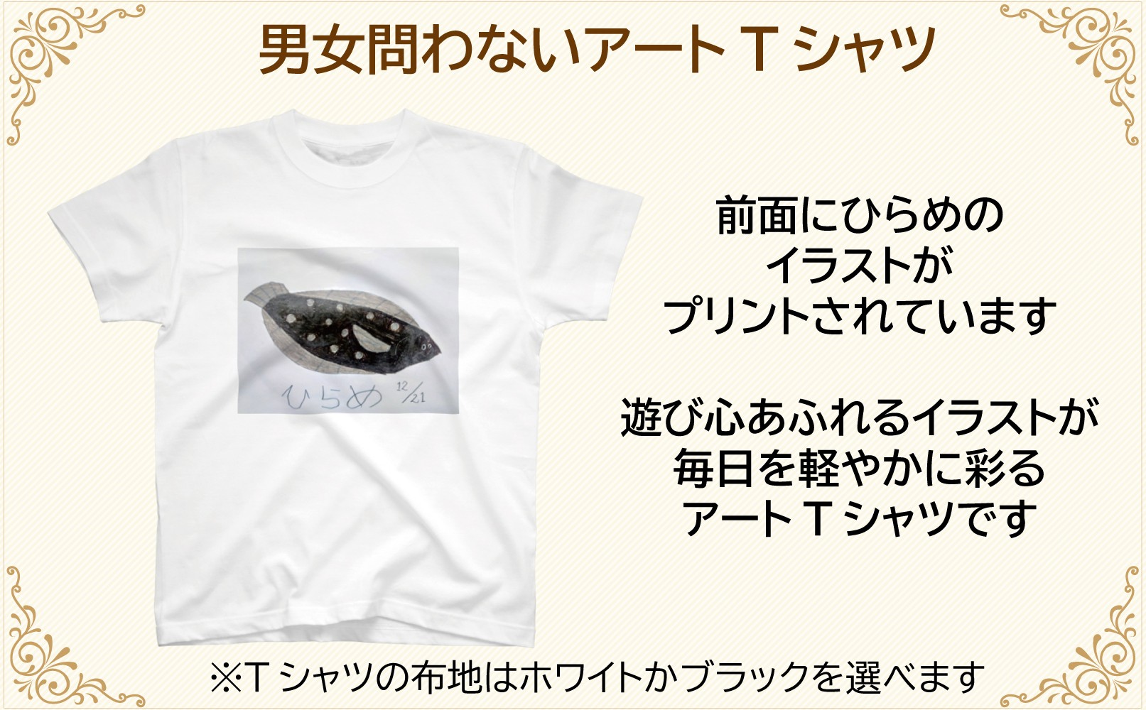 自閉症を持つ遠藤泰彦さんがデザインしたおもしろTシャツ 【選べるサイズ・カラー】オリジナル アートTシャツ 「ひらめ」 S M L LL ユニセックス 洋服 白 黒 メンズ レディース 半袖 フロントプリント ティーシャツ T-shirt 送料無料 就労継続支援B型 ふくちゃん 福島県 新地町
