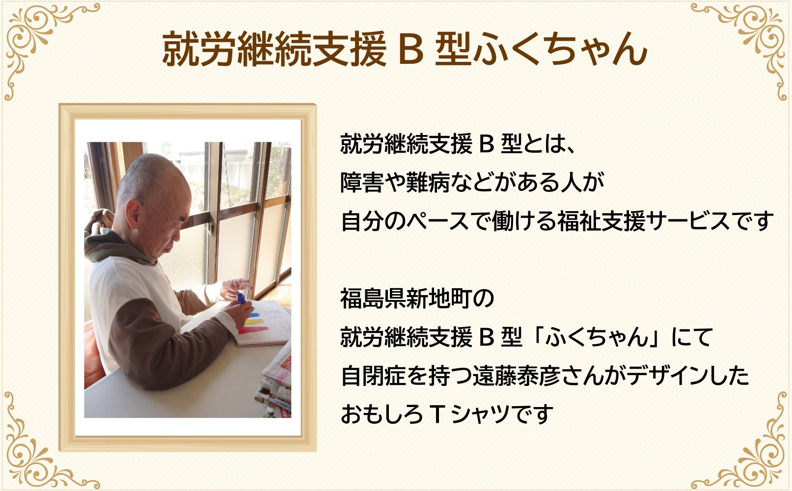 福島県新地町の就労継続支援B型「ふくちゃん」にて、自閉症を持つ遠藤泰彦さんがデザインしたおもしろTシャツです。