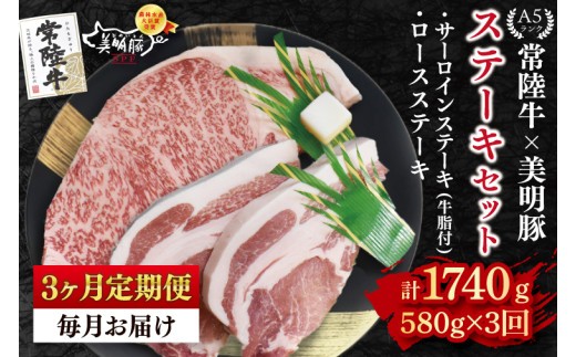 【3ヶ月定期便【常陸牛 A5ランク・美明豚ステーキセット】常陸…