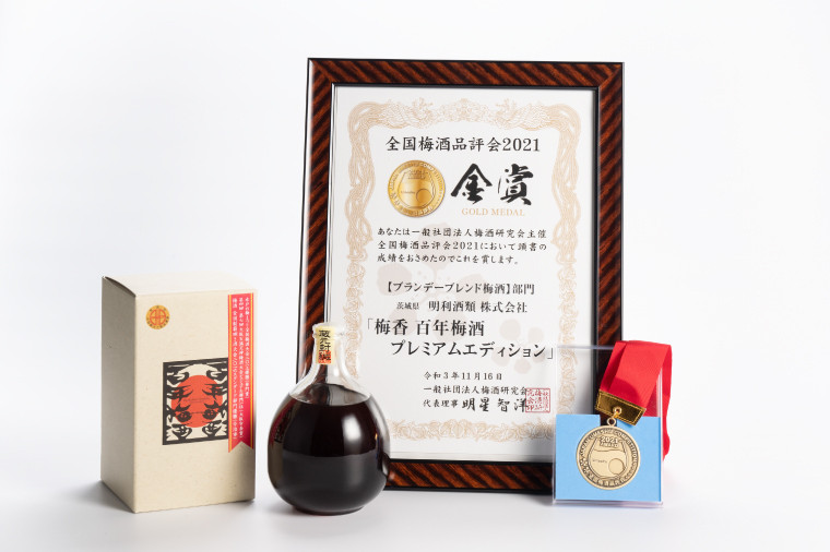 百年梅酒は、2008年の大阪天満天神全国梅酒大会で優勝し、日本一の称号をいただきました。また、2013年の水戸の梅祭り梅酒大会で黄門賞(第1位)となるなど、各地の梅酒大会で受賞しています。2014年茨城のおみやげコンテストで優秀賞を受賞、全国観光土産品連盟の推奨品にも認定されています。