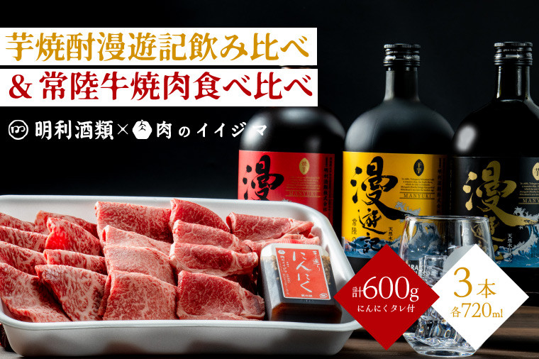 【明利酒類×肉のイイジマ】 水戸市で創業半世紀以上の肉のイイジマと、 江戸時代末期よりルーツを持つ、水戸を代表する老舗明利酒類のコラボ商品第一弾! 茨城が誇る牛肉と芋の最強タッグ。 常陸牛 赤身の旨味と上品な脂。 旨味と甘味でお肉の脂をさっぱり流してくれ、旨みを引き立てる。 <本格芋焼酎 漫遊記> 原料に茨城県産さつまいもを使用。昔ながらの常圧単式蒸留法で製造。 柔らかな香りと、ほんのりした甘みが特徴。 <本格干し芋焼酎 漫遊記> 茨城県産さつまいもの干し芋を使用。スッキリとした味と香り。 <本格焼き芋焼酎 漫遊記> 茨城県産さつまいもの焼芋を使用。焼芋の香ばしさが感じられる逸品。 【おすすめの飲み方】 ロック、炭酸割り、お湯割り、水割り <常陸牛焼肉3品> 水戸市で開業半世紀になる常陸牛専門店の肉のイイジマがおすすめする焼肉食べ比べセット。 常陸牛の旨味が存分に味わえる部位を三種類詰め合わせました。 相性抜群の手造りタレでどうぞ。 【原材料】 <漫遊記飲み比べ> 漫遊記 芋:さつまいも(国産)、米麹(国産米) 漫遊記 干し芋:さつまいも(国産)、米麹(国産米) 漫遊記 焼き芋:さつまいも(国産)、米麹(国産米) <常陸牛焼肉3品> 常陸牛肉(茨城県産) <にんにくタレ> 醤油、りんご、砂糖、バナナ、日本酒、ニンニク、人参、玉ネギ、みりん、赤酒、ゴマ、(一部に大豆・小麦を含む) 【注意事項】 ※20歳未満の飲酒は法律より禁止されています。20歳未満の方のお申込みはご遠慮ください。 【提供元】 明利酒類株式会社/肉のイイジマ