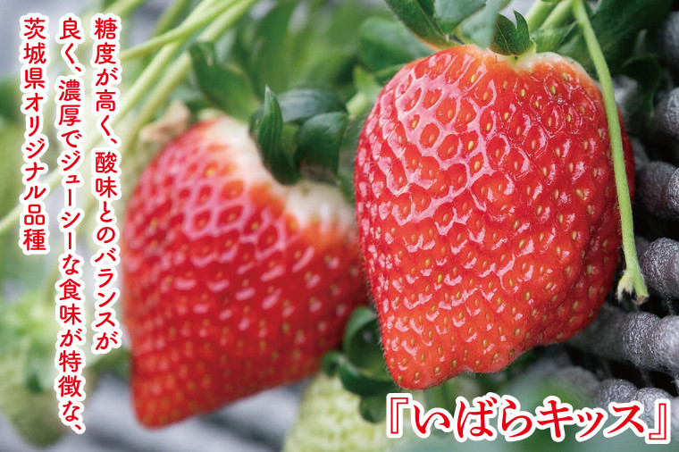 糖度が高く、酸味とのバランスが良く、濃厚でジューシーな食味が特徴な、茨城県オリジナル品種『いばらキッス』と酸味が少なく、香りと甘みがつまった淡いピンクのいちご。