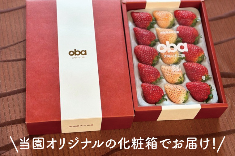 紅白に並べたいちごは贈り物にもぴったりなまさにフルーツの宝石です。お届けは当園オリジナルの化粧箱でお届けいたします。