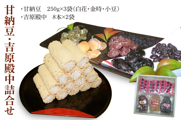 | 容量 | 甘納豆 250gx3袋(白花、金時、小豆)、吉原殿中 8本x2袋 |