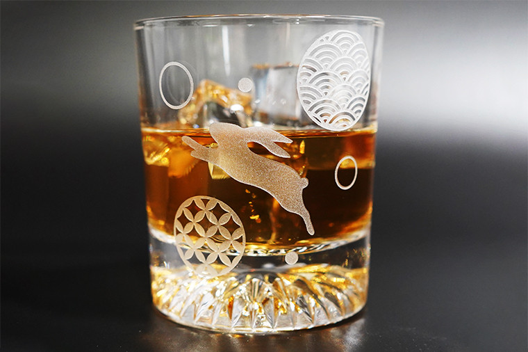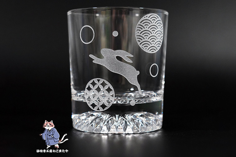 和柄と共にウサギをロックグラスに彫刻いたしました。