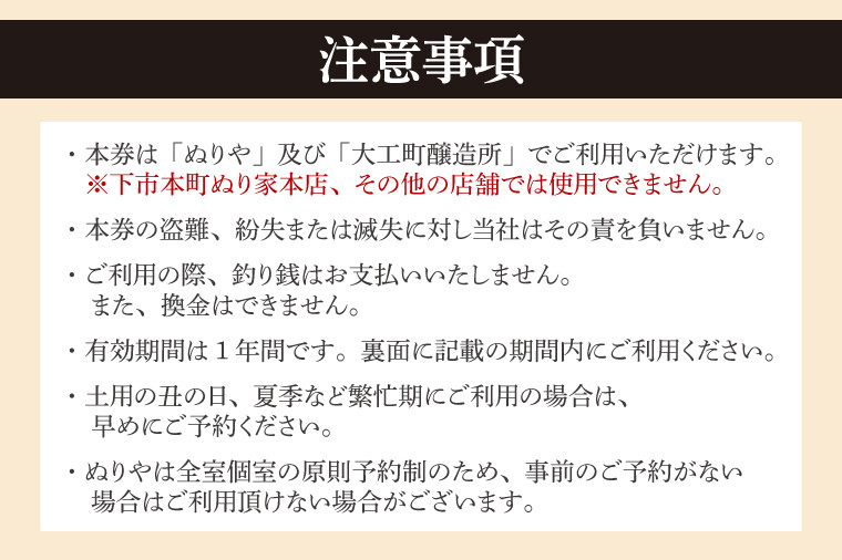 ぬりや及び併設の大工町醸造所タップルームでご利用頂ける、商品券となります。 武田双雲先生揮毫の屋号が入った券面を、専用封筒に入れてお届けします。 メニューは事前のご予約をお願いします。 ※タップルームは週2〜3日程度の不定期営業のため、SNSにて営業スケジュールをご確認ください。 本商品券は店舗でのご飲食、お持ち帰り、いずれでもご利用頂けます。酒税上、店舗での酒類のお持ち帰りには対応できないため、弊社製造の瓶ビールご希望の場合は、京成百貨店または、ふるさと納税の弊社クラフトビール取り扱いのページからご用命ください。 【注意事項】 ※本券は「ぬりや」及び「大工町醸造所」でご利用いただけます。 ※下市本町ぬり家本店、その他の店舗では使用できません。 ※本券の盗難、紛失または滅失に対し当社はその責を負いません。 ※ご利用の際、釣り銭はお支払いいたしません。また、換金はできません。 ※有効期間は1年間です。裏面に記載の期間内にご利用ください。 ※土用の丑の日、夏季など繁忙期にご利用の場合は、早めにご予約ください。 ※ぬりやは全室個室の原則予約制のため、事前のご予約がない場合はご利用頂けない場合がございます。