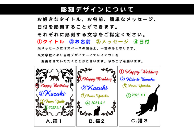 デザイン、文字の種類、彫刻のお色をゴールド、シルバー、ピンクからお選びいただけます。