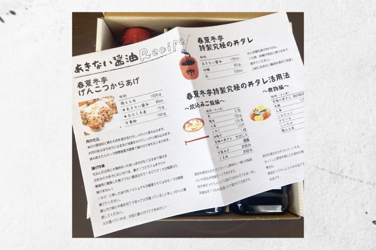 この春夏冬亭(あきないてい)の「あきない醤油」からあげの為の醤油のはずがほとんどの料理に使える魔法の醤油になっておりました。