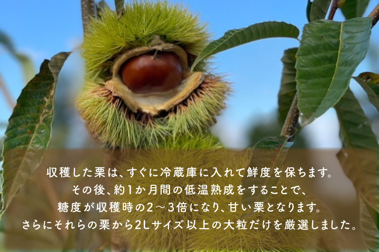 その後、約1か月間の低温熟成をすることで、糖度が収穫時の2~3倍になり、甘い栗となります。