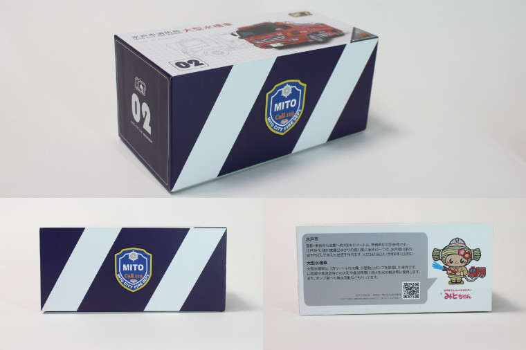 水戸市消防局さまに承認を頂き、固有の所属マークやご当地キャラクターにみとちゃん消防士もパッケージ印刷し地元水戸市のオリジナル感を出してます。