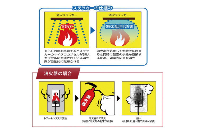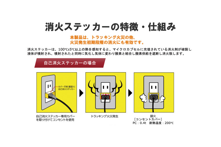 コンセントプラグへ被せるだけで初期火災をすぐに消すカバータイプのステッカーです。