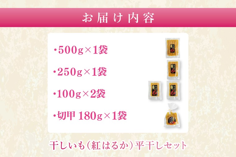 | 容量 | 干しいも(紅はるか) 平干し 500g×1 250g×1 100g×2 せっこう180g×1 |