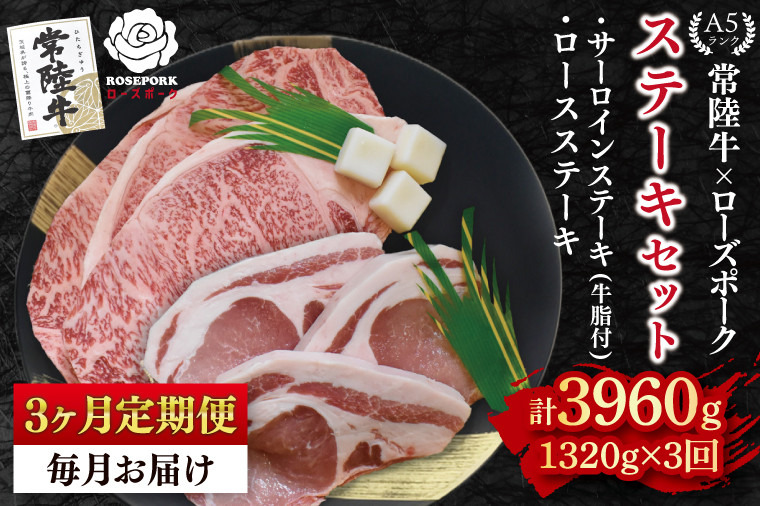 豊かな風味A5ランク【常陸牛】 きめ細かく柔らかい茨城が誇る【ローズポーク】 【3ヶ月定期便】【常陸牛 A5ランク・ローズポークステーキセット】常陸牛サーロインステーキ900g(300g×3枚)+ローズポークロースステーキ420g(140g×3枚) 冷凍 国産牛 和牛 牛肉 豚肉 ブランド豚 茨城県 水戸市 食べ比べ セット商品 国産 老舗精肉店(EK-46_1)