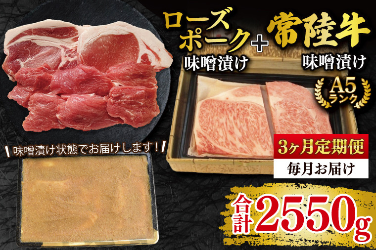 豊かな風味A5ランク【常陸牛】 きめ細かく柔らかい茨城が誇る【ローズポーク】 【3ヶ月定期便】【常陸牛 A5ランク・ローズポーク味噌漬けセット】常陸牛味噌漬け350g+ローズポーク500g(ロース200g・ヒレ300g) 冷凍 国産牛 和牛 牛肉 豚肉 ブランド豚 茨城県 水戸市 食べ比べ セット商品 国産 老舗精肉店(EK-71_1)